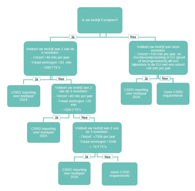 Benieuwd vanaf wanneer de verplichtingen voor uw onderneming gelden? Middels onderstaande figuur kunt u beoordelen of en vanaf wanneer op uw onderneming de duurzaamheidsrapportage verplichting van toepassing is:
